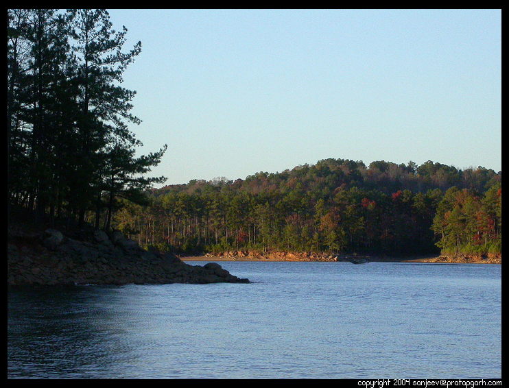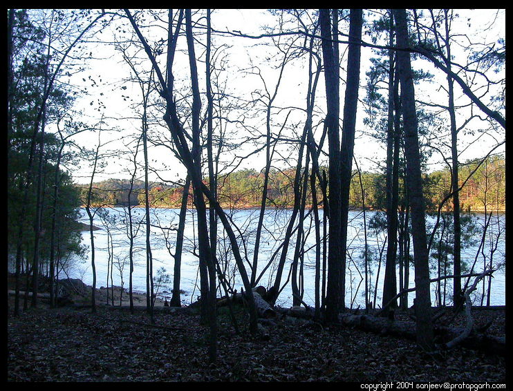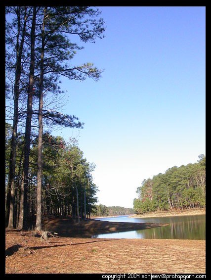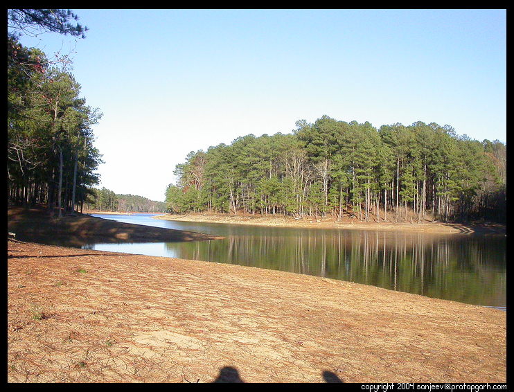 In this season, the shoreline of the lake has receded a bit. Trees that once